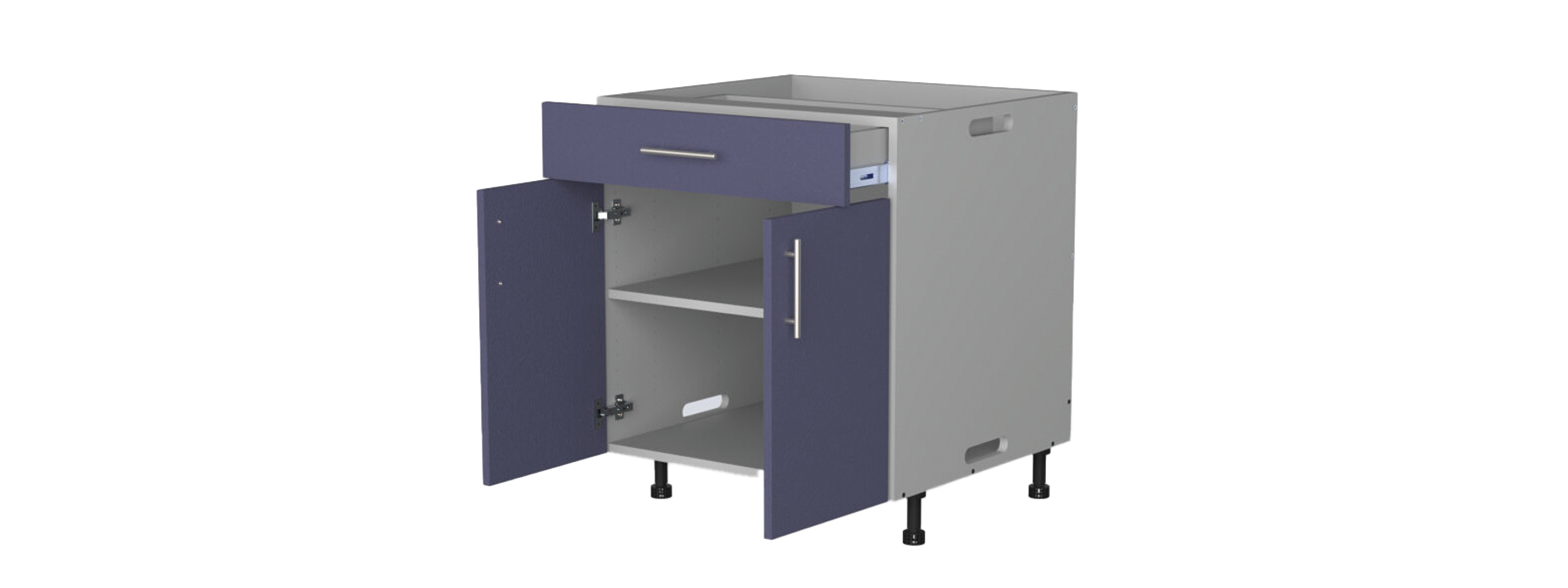 Base cabinets are shipped fully assembled, ready to be installed on 'Sure Level' adjustable polymer legs. Decorative stainless steel legs are also available as an accessory.